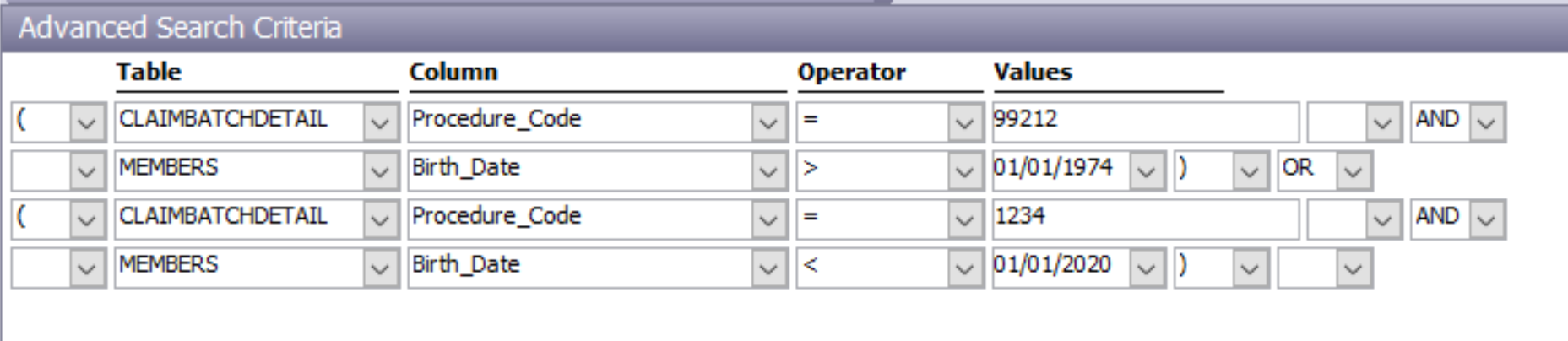 ORcondition linking another set of filters (Procedure_Code = 1234ANDBirth_Date < 01/01/2020).